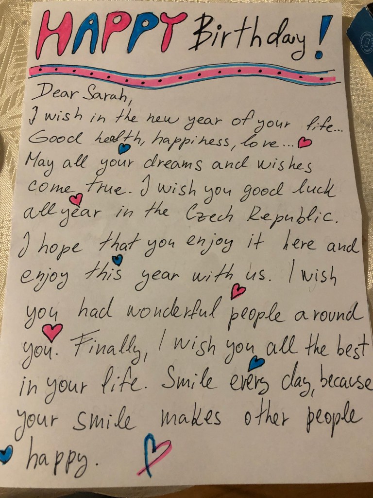Finally, my birthday was this past week and it was the first birthday I was not able to share with my family. I was worried how the day would pan out but my school community, and new Czech family, exceeded my expectations. The teachers and students sang, made cakes, and brought me lots of chocolate, some jewelry, and even a stuffed elephant and a couple jars of peanut butter. I also went out with a fellow Fulbrighter and another friend for pizza, and of course Czech beer, in the town square and received several thoughtful gifts, cards and calls from loved ones back home. Everybody also congratulated me all day, and gave me two kisses on my cheek – a Czech birthday tradition, signifying a celebration of another year you have survived!