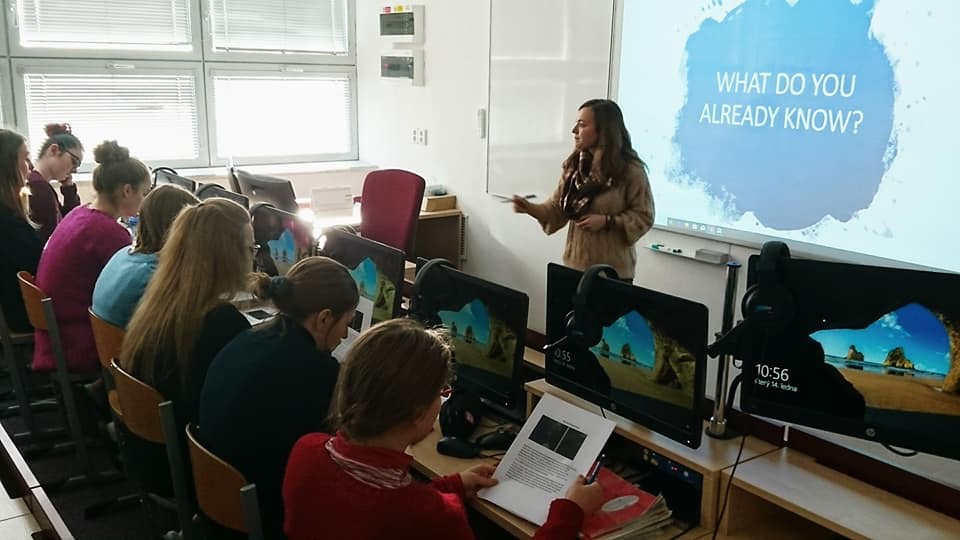 Me in front of, and teaching Maturita students at Gymnasium Česky Têšín.